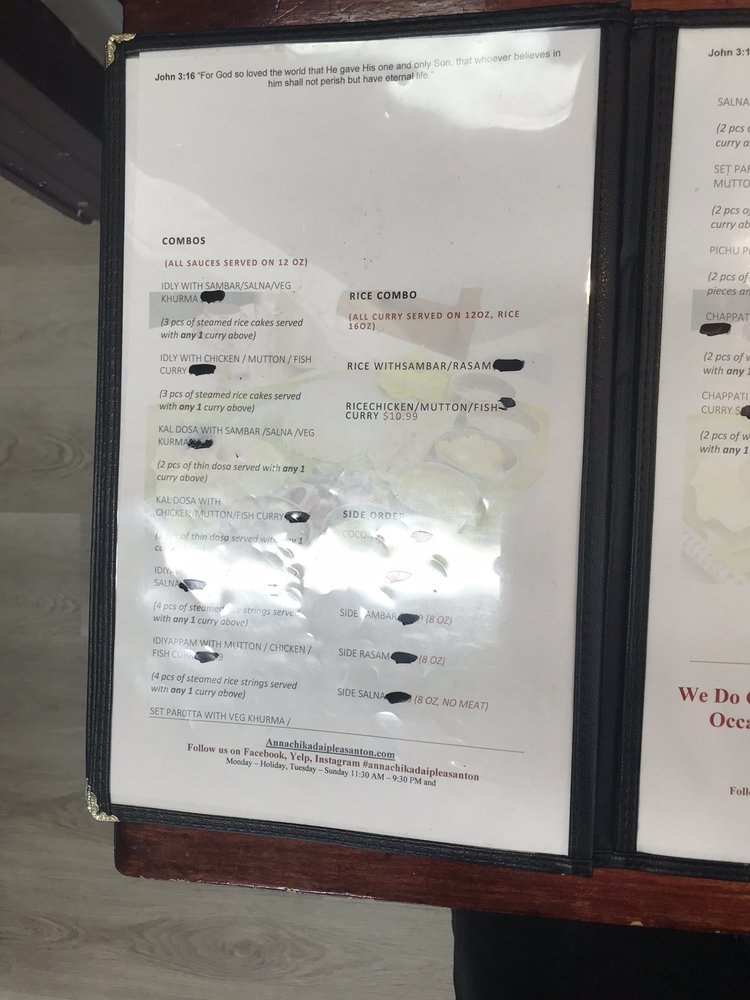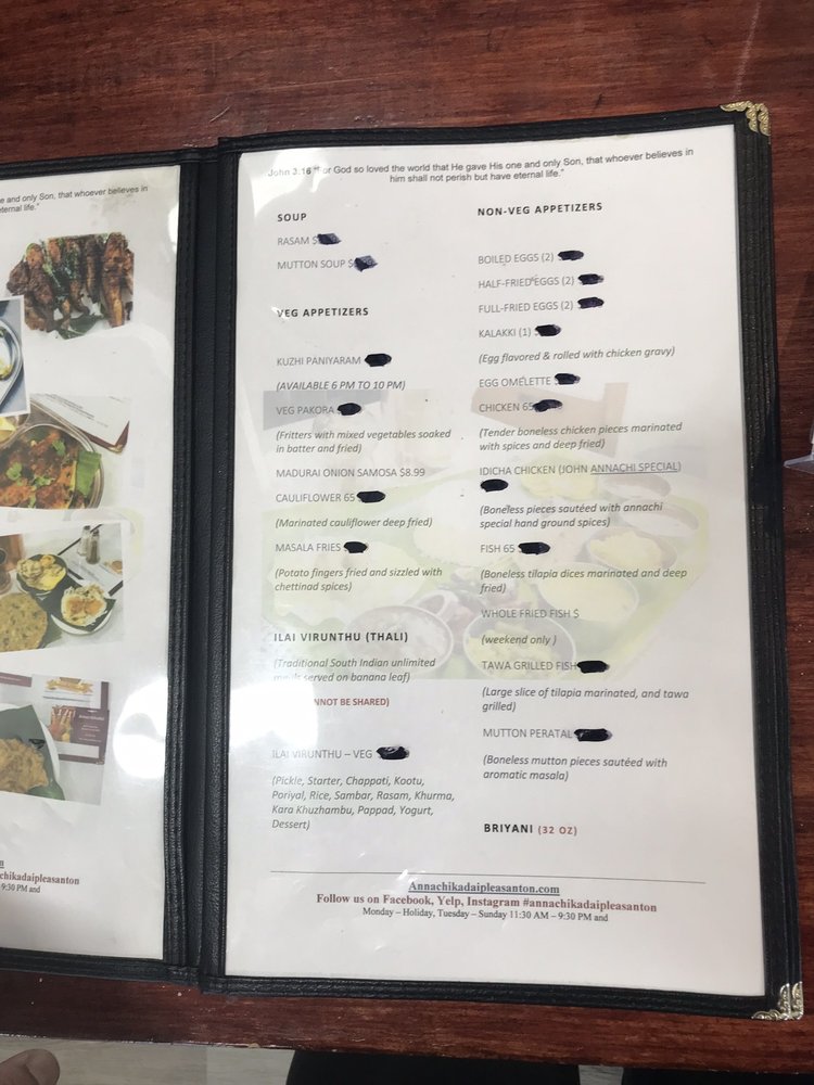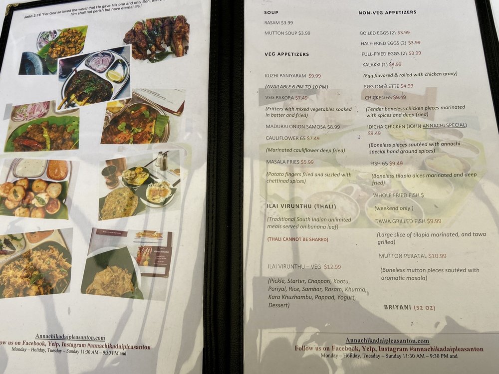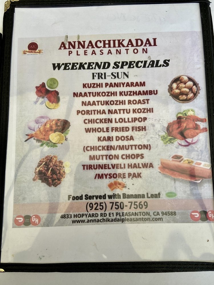 Annachi Kadai is a must-visit South Indian restaurant in Pleasanton, CA. Located at 4833 Hopyard Rd Unit E1, they offer a wide range of dosa options, including the flavorful Annachi Chicken Kari Dosa and the classic Masala Dosa. Their Ilai Virunthu (Thali) in a traditional banana leaf is a customer favorite, with both non-veg and veg options available. Customers praise the authentic home-style cooking and the absence of artificial colors in dishes like Chicken 65. The Wednesday Biryani deal is highly recommended for its delicious taste and value for money. With exceptional service and reasonable prices, Annachi Kadai provides a warm and welcoming dining experience. Don't miss out on their special meals during festivals like Diwali.